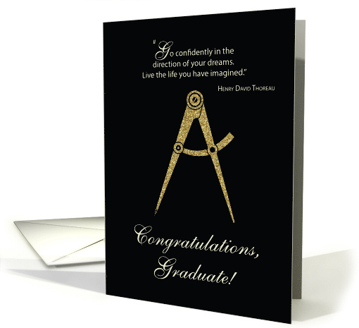Celebrate the achievement of an engineering graduate with this elegant black and gold graduation card. Featuring a compass icon symbolizing direction and purpose, and a quote by Henry David Thoreau, "Go confidently in the direction of your dreams and live the life you imagined," this card is perfect for a graduate stepping into the world of engineering. The inside message offers warm wishes for a future filled with success, making it an ideal way to honor their dedication, hard work, and the exciting journey ahead in their engineering career.