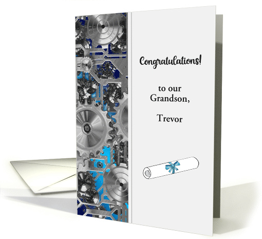 | Artist Notes: | Give this custom name and relationship congratulations card to someone who has graduated with a mechanical engineering degree. The cover features gears, a diploma, black headline, and room for the name and relationship. You may change the inside message if you wish. ©Gail Pepin |