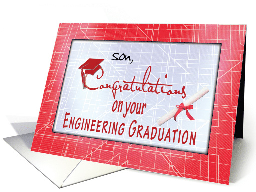 | Artist Notes: | Congratulate your son on his engineering degree as he graduates. Red background with the blueprint adds a warmth. Red lettering and a red tie on the diploma complete the look. Thanks to Natalie Kinnear for the scroll. |