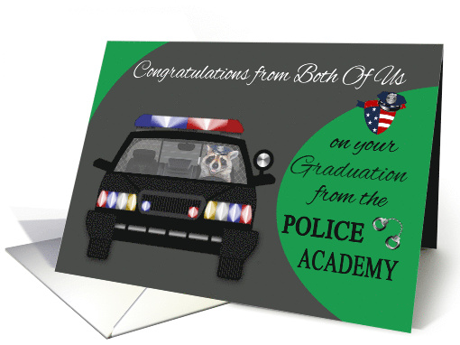 Congratulate anyone in general on their graduation from the police academy from both of us with a card featuring a raccoon, Rocky a police officer wearing a hat sitting in a police car driving on a gray road surrounded by grass. The background has white and black text and a red, white and blue shield with a hat. Some elements by J. Rett Graphics. Law enforcement agencies have rank structures that are very similar to the military. Typically, a police department's chain of command will start with the rank of officer or deputy, or in the case of state agencies, trooper. The ranks will include sergeants, lieutenants, captains, and majors. At the bottom of the ladder is the police academy recruit.