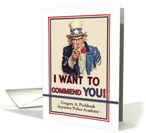 | Artist Notes: | Uncle Sam is featured on this card to commend someone for graduating from the police academy. A "thin blue line" with a shadow is across the card. Add the special graduate's name and academy information to the front of the card. |