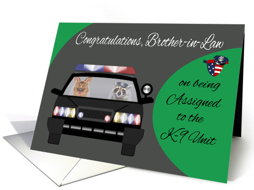 | Artist Notes: | Congratulate your brother-in-law on assignment to the K9 unit with a card featuring a raccoon, Rocky a police officer wearing a hat sitting next to his partner a cute German Shepherd, driving on a gray road surrounded by grass. Background has white and black text and a red, white and blue shield with a hat. Inside like all GCU cards can be personalized by you if you wish to give it your own personal touch. Some elements byJ. Rett Graphics/Scap by Miggins |