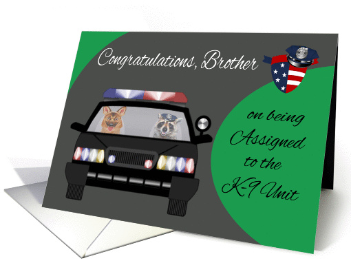 | Artist Notes: | Congratulate your brother on assignment to the K9 unit with a card featuring a raccoon, Rocky a police officer wearing a hat sitting next to his partner a cute German Shepherd, driving on a gray road surrounded by grass. Background has white and black text and a red, white and blue shield with a hat. Inside like all GCU cards can be personalized by you if you wish to give it your own personal touch. Some elements byJ. Rett Graphics/Scap by Miggins |