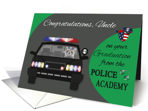 | Artist Notes: | Congratulate your uncle on his graduation from the police academy with a card featuring a handsome raccoon, Rocky a police officer wearing a hat sitting in a squad car driving on a gray road edged with a grassy area. The background has white and black text accentuated with a red, white and blue shield. Some unedited elements by J. Rett Graphics |