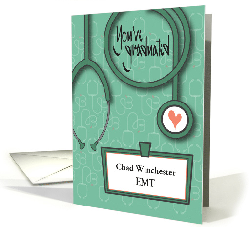 If you know a recent paramedic or EMT graduate that you would like to congratulate, either someone who works with you or is a personal family member or friend, this personalized card is ideal for the occasion. The card's name tag is tucked into the bottom right corner, with the letters "EMT" already on it. Just above this designation is a line where you type in the paramedic graduate's name, as you order their card. Above, on the card, a greenish-teal stethoscope fills the card with portions of the medical instrument, with a cord that ends with a lovely pink heart. Rolled into the circling cord of the stethoscope are hand lettered words that says, in black, "You've Graduated". The background is green scrubs, just like those worn by this group of medical specialists. The inside wording of the card says "Best wishes for a wonderful future following your graduation as a paramedic."