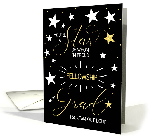| Artist Notes: | Let the Fellowship Grad know they are a star of whom you're proud when you send this graduation congratulations greeting in gold and white stars and text on black. |