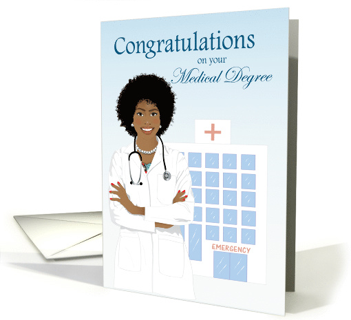 Artist Notes: | This Afrocentric Medical school graduation for women shows a beautiful, confident, smart, and happy black (African American) woman medical doctor. She is wearing a white lab coat, a African Print top, white pearls necklace and earrings, and an stethoscope behind her neck. She has a beautiful smile and is wearing her naturally gorgeous curly hair in a Afro. The front of the card reads "Congratulations on your medical degree and the background is a hospital |