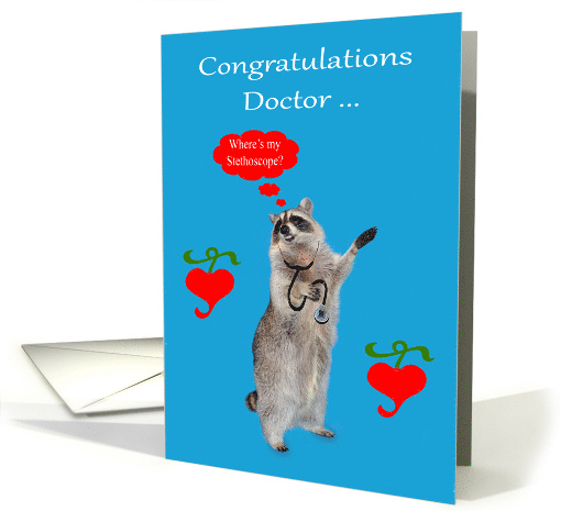 | Artist Notes: | Congratulate someone for their graduation from medical residency program with an adorable raccoon, Bullwinkle looking for his stethoscope which is around his neck. The background is a pretty blue with hearts and white text. Completing a medical residency gives you the opportunity to study and practice medicine in a paid capacity under the supervision of licensed physicians. |