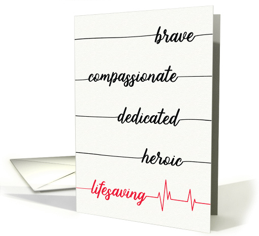 | Artist Notes: | Congratulate someone on receiving their medical degree with this unique typography design art featuring the message, "brave, compassionate, dedicated, heroic, lifesaving." The word "lifesaving" is highlighted in red at the bottom of the card and extends into an EKG graphic. Inside can be customized with your own personal message. |