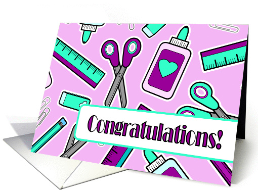 | Artist Notes: | Cute cartoon school supplies on a purple background. Scissors, glue, eraser, ruler and paper clip pattern. The perfect way to congratulate someone on earning their teaching degree. |