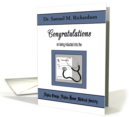 | Artist Notes: | Congratulate an Alpha Omega Alpha Honor Medical Society Inductee with this contemporary white card that features blue borders, black text, a center blue square with a stethoscope and blank prescription. Customize with the inductees name. Card ©2015 Kreative Sentiments Cards by Sherry Harris |