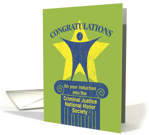 | Artist Notes: | This Congratulations Criminal Justice National Honor Society Inductee greeting card features graphic style artwork of a stylized blue figure standing with arms open wide on a pedestal in front of a yellow star on a green background. |