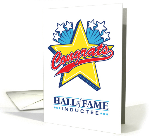 | Artist Notes: | Hall of Fame inductee greeting card features graphic style artwork of a large yellow star and smaller white stars with custom congrats lettering. |
