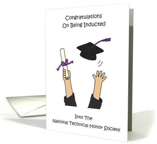 | Artist Notes: | A simple illustration of two arms in the air, one is holding a scroll and the other is throwing a graduation hat cap which has a purple tassle. The image is set against a white background and accompanied by the words 'Congratulations on being inducted into the National technical Honor Society'. |