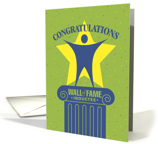 | Artist Notes: | Congratulation wall of fame inductee. Stylized figure standing on a pedestal with arms in the air. Green background with multicolored confetti falling. |