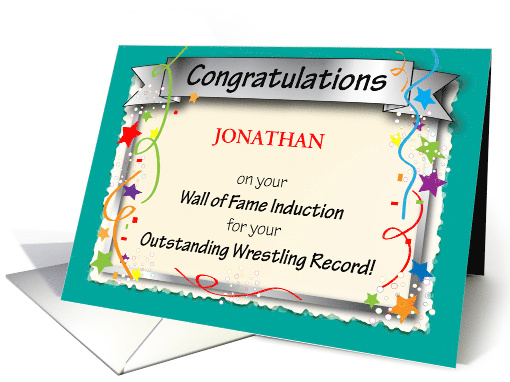 | Artist Notes: | This is a custom name congratulations for someone who was inducted onto a "Wall of Fame" for an outstanding wrestling record. The cover features black text, confetti, stars, a teal border, streamers, a banner, and room for the inductee's name. You may change the inside message if you wish. ©Gail Pepin |