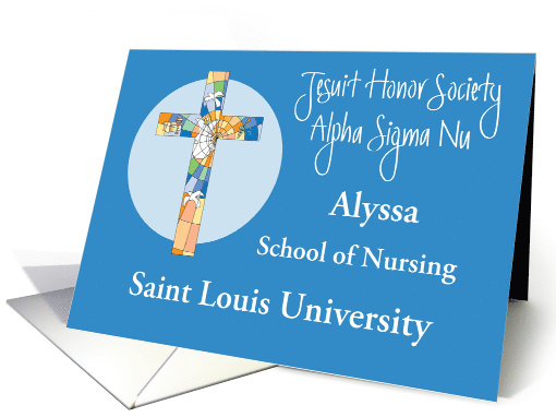 This elegantly beautiful card of congratulations will show the depth of your pride in someone special's graduation induction into the Jesuit Honor Society of Alpha Sigma Nu. A large and colorful stained glass cross, with religious images, fills the top left corner of the blue card, with the lovely white hand lettered wording "Jesuit Honor Society Alpha Sigma Nu" filling the top left. Below this elegant wording are three spaces for you to type in the recipient's name, their area of study and the school they are graduating from, making this a personalized card that will be a keepsake forever for them. The touching inside wording of the card is "We are so proud of your accomplishment and know God will use your gifts to make a positive difference in the lives of many people. Sincere congratulations on your honor."