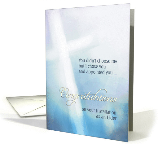 | Artist Notes: | Send stylish "Congratulations on your Installation as an Elder" with this card featuring a white cross on a blue background (digital watercolor). Scripture text is John 15:16 (You didn't choose me but I chose you and appointed you ...). You can edit text inside (That you should go and bear fruit, and that your fruit should remain; that whatever you will ask of the Father in my name, He may give it to you. ~John 15:16~ May the Lord bless you and keep you, fill your life with His joy and sustain you by His grace). |