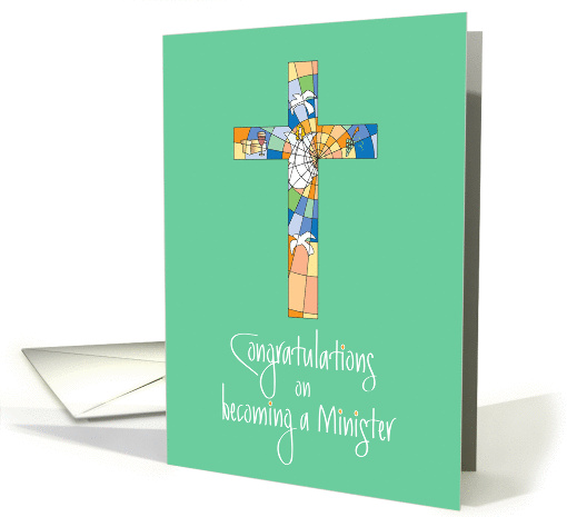 | Artist Notes: | "Congratulations on becoming a Minister" is the hand lettered wording, in white, at the lower part of this beautiful green card for someone who has recently been ordinated as a Minister. Directly above the elegant wording, is a spectacular cross, containing a myriad of colors that range from blues to oranges with religious images intertwined into the design of the cross. The card's inside wording is "Best wishes as you serve God in your role as a Minister." |