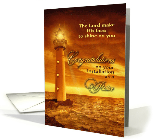 | Artist Notes: | Congratulate the newly installed Pastor on his Installation with this elegant Christian card featuring scripture (Numbers 6:24) and a light-tower, symbol of Jesus, the Light of the World. You can customize message inside the card. |