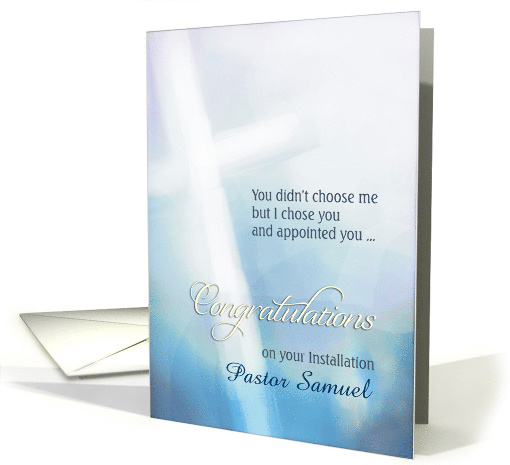 | Artist Notes: | This is a template. Just add the name of the recipient to the placeholder and send stylish "Congratulations on your Installation as a Pastor". This card features a white cross on a blue background (watercolor). Scripture text is John 15:16 (You didn't choose me but I chose you and appointed you ...). You can edit text inside (That you should go and bear fruit, and that your fruit should remain; that whatever you will ask of the Father in my name, He may give it to you. ~John 15:16~ May the Lord bless you and keep you, fill your life with His joy and sustain you by His grace). |