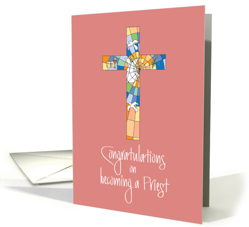 This beautiful card is the perfect way to congratulate a new Priest or someone who has recently been ordained as a Priest. The card's wording is hand lettered, in a lovely white lettering, at the base of the salmon colored card, with the words "Congratulations on becoming a Priest". The top and center of the card displays a magnificently designed stained glass cross that contains a range of colors, that includes rich blues, soft oranges and vivid greens, for an overall brilliant sense of a Church's elegant glass window. The wording inside the card says "Best wishes as you serve God in your role as a Priest."