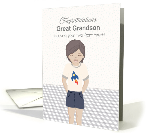 | Artist Notes: | Great Grandson lost his two front teeth? Congratulate him for being brave with this illustrated card featuring a boy in a t-shirt with rocket design, and wearing shorts. Background is a dotted wall and plaid floor. |