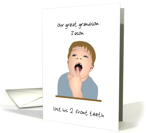| Artist Notes: | A card for a little boy who has lost his two top front teeth. The sketch shows a little guy pointing to his missing two front teeth. This design is customizable for the relation and name. |
