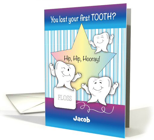 | Artist Notes: | When a child loses the first tooth, give this custom name card to show your happiness. The cover shows 3 happy teeth, a colorful star, a package of floss, and a striped blue background. There is a white headline at the top and a black headline across the star. The inside message may be changed, if you wish. ©Gail Pepin |