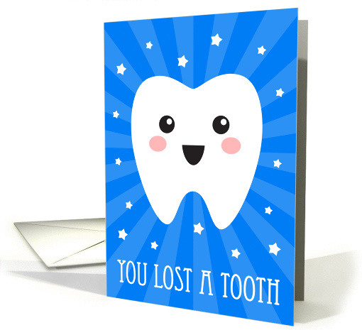 | Artist Notes: | Fun greeting card featuring a kawaii style tooth on a blue sunburst background. White stars are scattered around the tooth. Text on the front: you lost a tooth. Customizable text inside: congratulations on loosing your first tooth! A cute and fun design for a boy or girl who lost a tooth! |