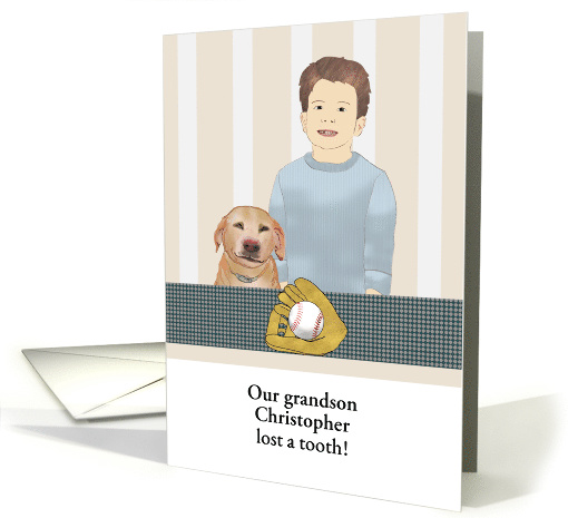 | Artist Notes: | Card for a young boy between 9 and 10 years old who has lost a tooth. This design features our young man standing by his pet dog. To the front is a baseball and mitt. The background is a striped pattern in soft grey and beige. This design is customizable for the name and relation. |