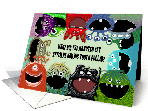 Congratulate them on a new dentist job with a good Dentist joke. A group of smiling monster dentist patients surround the outside of this funny card.