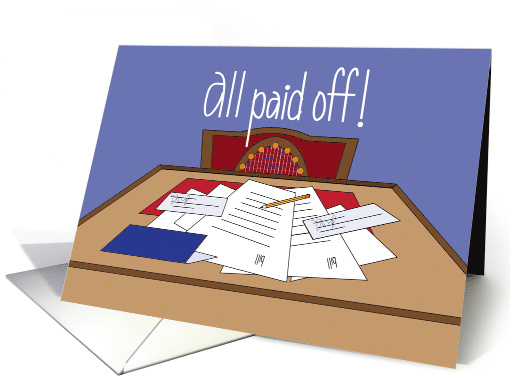 | Artist Notes: | Congratulate someone special you know who has just paid off all of their bills! What an accomplishment! This fun and colorful card will congratulate them for paying off their loans and bills - with its cute desk filled with a scattering of bills, checkbook and checks. The hand lettered message above the desk on the blue background is "All paid off!". The inside wording is "Congratulations!" |