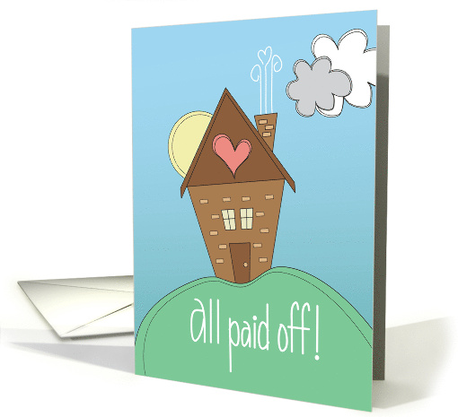 "All Paid Off!" is the tall and thin white hand lettered wording written on the semicircle green hill, at the bottom of this congratulations card to someone who has just made the final payment on their home mortgage. The card's two story cottage sits on a green hill and has a pink heart above the front door. White smoke ringlets drift up the chimney, in the shape of a heart, from the fireplace inside. On one side of the house, the round yellow sun pops over the top of the angled roof and on the right side, two clouds fly across the sky. The inside wording of the card says "Congratulations for paying off your home mortgage!"