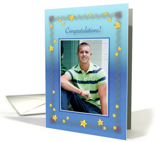 | Artist Notes: | This is a photo congratulations card, featuring a gradient blue background decorated with a festive border of stars. There is room on the card front for a name. You may change the inside message at checkout, if you wish. 072912 |