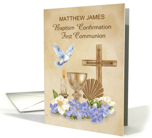 This personalized card is a beautiful way to honor someone’s journey through Baptism, First Holy Communion, and Confirmation. Their name is featured on the front, making this a truly special keepsake. A meaningful arrangement of Christian symbols—a cross, chalice, candle, shell, and dove—represents the deep faith and blessings of these sacraments. Set against a soft tan background with gentle texture, the design conveys warmth and reverence. Inside, a heartfelt message shares blessings and congratulations, making this a thoughtful choice for such a sacred milestone.