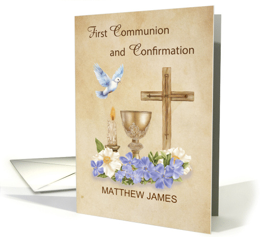 Celebrate a meaningful step in faith with this elegant Communion and Confirmation card, personalized with the recipient’s name on the front. Featuring a beautiful arrangement of Christian symbols—including a cross, chalice, candle and dove—this design reflects the sacred significance of these holy sacraments. A soft tan background with subtle texture adds warmth and grace, making it a cherished keepsake. Inside, a heartfelt message offers blessings and congratulations, perfect for commemorating this special occasion.