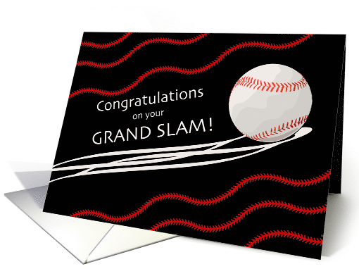 Congratulations on your Grand Slam, paper greeting card with a baseball and white action lines shooting out from behind the baseball. Red wavy stitches on black fill in the background. Whoosh! Victory!