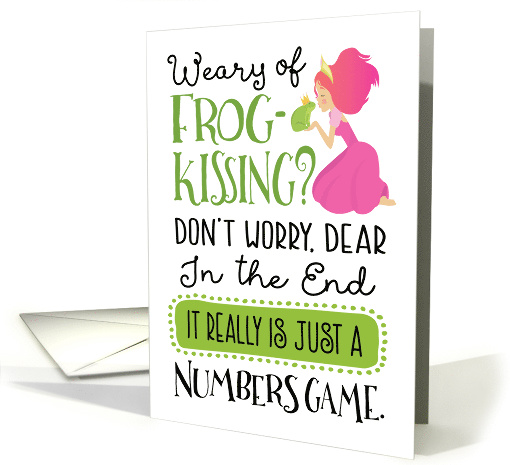 | Artist Notes: | Know a gal who has had her share of frogs in her quest to find her prince? Remind her to stay in the game with this fun hand-lettering style card, featuring the message, "Weary of Frog-Kissing? Don't worry, dear. In the end, it really is just a Numbers Game." Inside features the message. Keep Going! Find your Prince. But can be customizes with your own message. |
