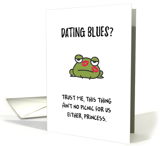 | Artist Notes: | Know a gal who has had enough of the dating game? Give her a laugh with this fun card featuring a frog illustration with a "less-than-thrilled" look on this face. Title at top reads, "Dating Blues?" with caption beneath "Trust me, this thing ain't no picnic for us either, princess." Inside can be customized with your own message. |