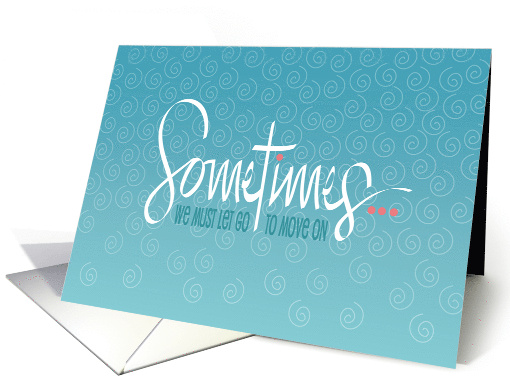 | Artist Notes: | If you recently have experienced a Break-up of an important relationship with your Boyfriend or Ex Spouse and would like to extend both encouragement and a thank you to this person with whom you had the relationship, this elegant and beautifully hand lettered card will be an excellent way to say these words to this person. The large word "Sometimes" sweeps across the aqua-colored card, with additional wording that says "We must let go to move on". Dots of orange color brighten the wording. The inside words continue the thoughts you want to extend to the recipient with wording that says "Wishing you a wonderful future, as we take our own separate paths. You have been both a blessing and a lesson to me during our time spent together." |