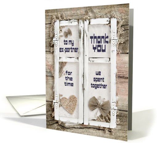 | Artist Notes: | Send an encouraging word to your ex-partner who is no longer in your life but you appreciate the time you spent together and your memories are special to you. Vintage effect design features a wood effect background with a white washed window frame with a paint effect element, a beige doily, a cork heart, and a burlap butterfly. |
