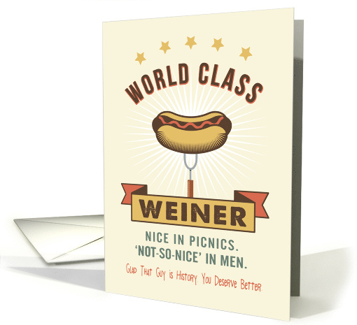 | Artist Notes: | Encourage a gal going through a breakup with this vintage typographic design card featuring the message "World Class Weiner. Nice in Picnics. Not-so-nice in Men. Glad that guy is history, You deserve better." Design features hot dog on fork illustration with banner and light ray and star accents on creme background. Inside can be customized with your own message. PLEASE NOTE: This design INTENTIONALLY INCLUDES DISTRESSED-STYLE GRUNGE EFFECT for word, "WEINER" and this is NOT a PRINTING ERROR. |