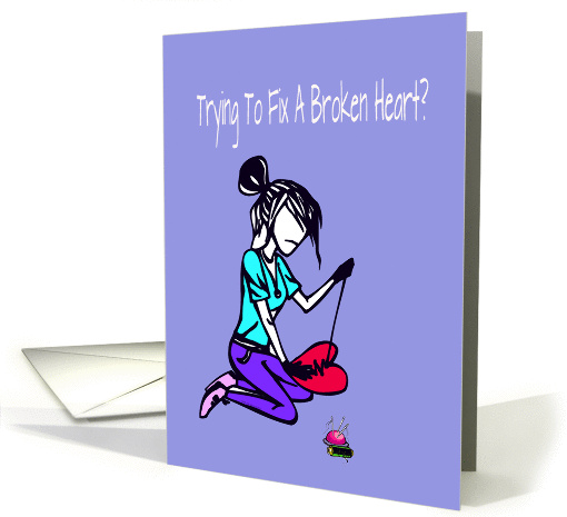 | Artist Notes: | Broken hearted girl encouragement card. This image of a girl sewing together a heart that has split in two, will strike a chord for any girl who has broken up with a partner. |