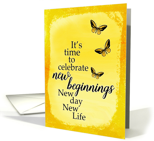 | Artist Notes: | Encourage someone going through a divorce or separation with this inviting card, featuring the message in black letters, "It's time to celebrate New Beginnings. New Day, New Life." Background includes black and yellow butterflies on yellow watercolor background with distressed border effect. Inside can be customized to fit your personal needs. |