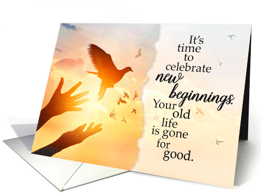 | Artist Notes: | Encourage someone going through a divorce or separation with this inviting card, featuring the message in black letters, "It's time to celebrate New Beginnings. Your old life is gone for good." Background includes silhouetted hands freeing bird with additional birds flying with striking sunset sky. Inside can be customized to fit your personal needs. |