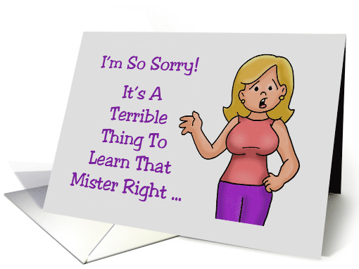 | Artist Notes: | Encouragement card for a woman who has recently gone through a break-up or a divorce. There is a cartoon woman on the front saying, I'm so sorry! It's a terrible thing to learn that Mister Right ... Inside says, ... is Mister Wrong! Perhaps this is for the best. |