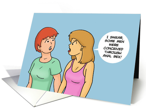 | Artist Notes: | Humorous Encouragement Card for someone going through a Divorce/Break up, with two cartoon women. One says: I swear, some men are conceived through anal sex! Inside says: There is no other way they could be such assholes! I know it's hard right now, but this really is for the best. |
