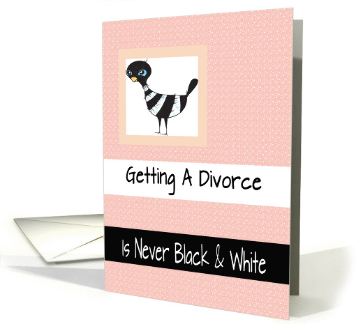 | Artist Notes: | Getting a divorce is never black & white. Cute magpie and black & white text bands. Inside reads ... Don't be blue, don't see red, and before you know it, life will be just peachy again. Magpie by kind permission of Pixels & Ice Cream. |