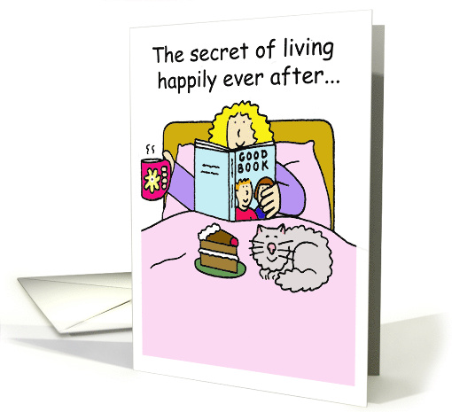 | Artist Notes: | Colorful cartoon of a woman lying in bed reading a novel and holding a hot drink. There is a slice of chocolate cake on a plate on the bed and a happy grey cat snoozing. The card says 'The secret of living happily ever after...' on the front of the card . Inside, the card says '...is to do it alone'. |